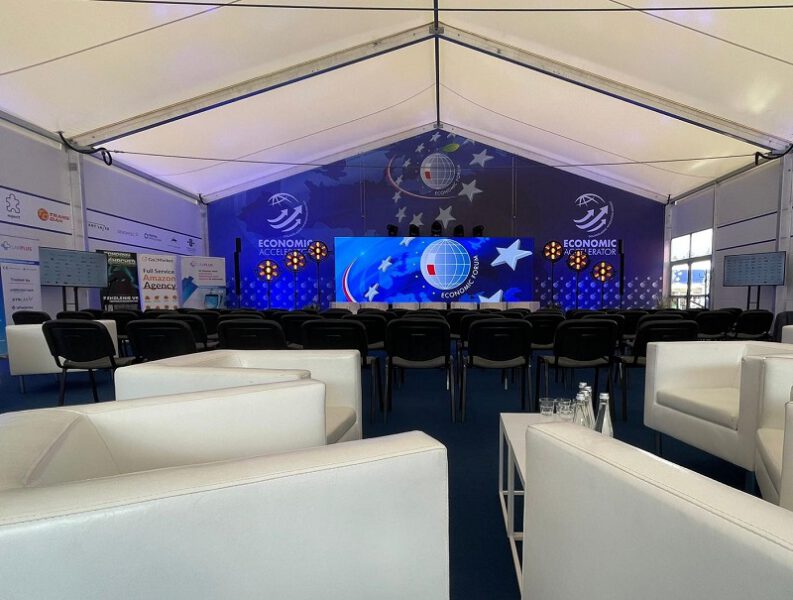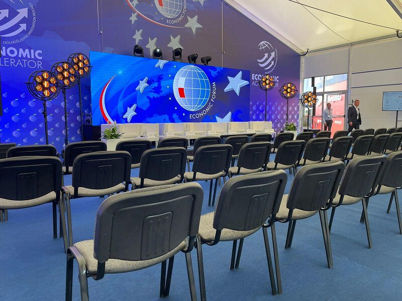 Na zbudowanej scenie stanął panoramiczny ekran LED w zaokrągleniu tworząc multimedialne tło dla prelekcji i towarzyszących wydarzeń. Poza wewnętrznym telebimem diodowym, LEDCITY dostarczyło także telewizory i prompter ułatwiające wystąpienia. Klimatyczne oświetlenie, profesjonalne nagłośnienie i dekoracje uzupełniły całą scenografię. Nad całością realizacji czuwali natomiast niezawodni realizatorzy dźwięku i obrazu, którzy przy profesjonalnie wykonanej architekturze połączeń, dbali aby treści wyświetlane na multimedialnym ekranie led i telewizorach były kompatybilne, a dźwięk był czysty i bez zakłóceń.