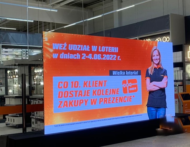 Podczas eventów promocyjnych „Wielka Loteria OBI” w jednej z sieci sklepów budowlanych postawiono ekran LED P2 o wymiarach 4,5m x 2,5m na podeście.